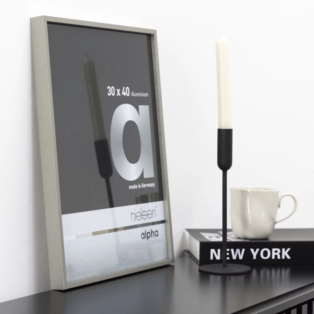 Bilderammen Alpha fra Nielsen er tilgjengelig med to glass: Floatglass med slipte kanter eller antireflekterende glass. Bruken av kvalitetskomponenter som ekstra sterke hjørneforbindelser og et stabilt bakpanel med dreiefjærer av høy kvalitet gjør denne rammen spesielt dimensjonsstabil.