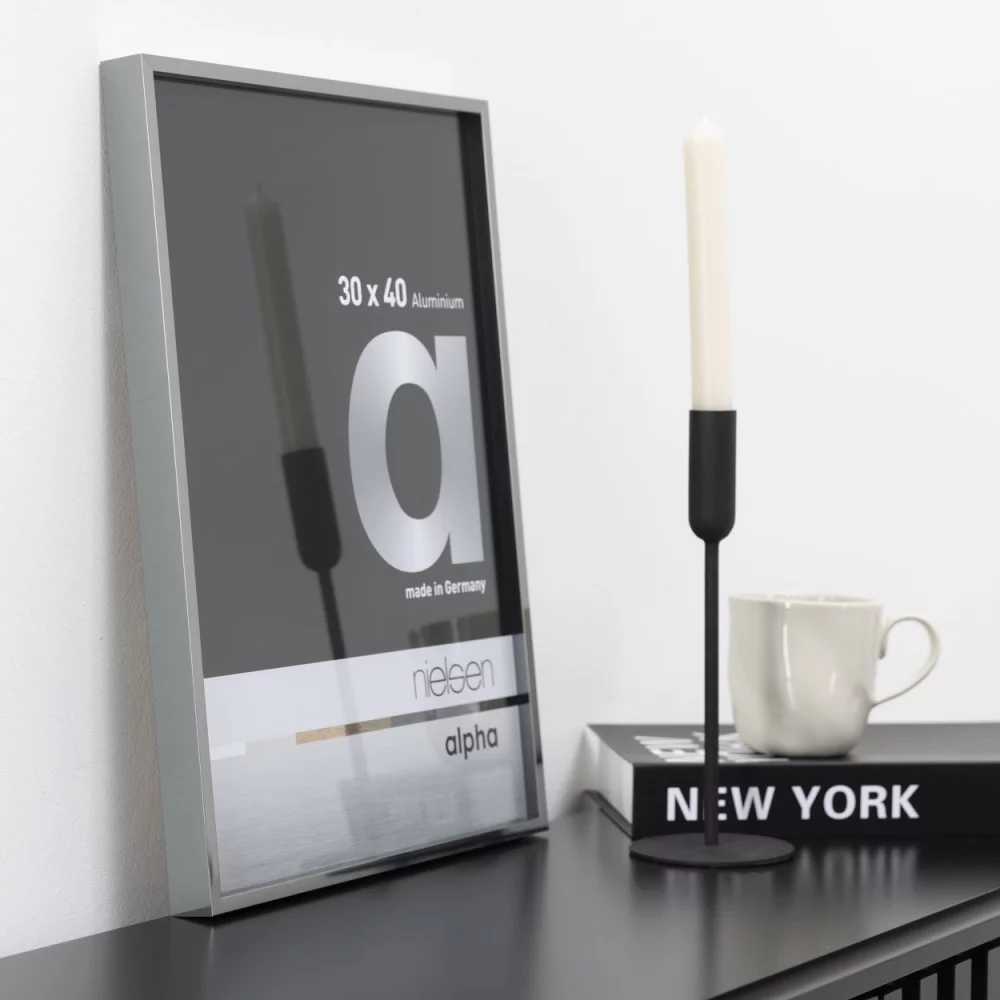 Bilderammen Alpha fra Nielsen er tilgjengelig med to glass: Floatglass med slipte kanter eller antireflekterende glass. Bruken av kvalitetskomponenter som ekstra sterke hjørneforbindelser og et stabilt bakpanel med dreiefjærer av høy kvalitet gjør denne rammen spesielt dimensjonsstabil.