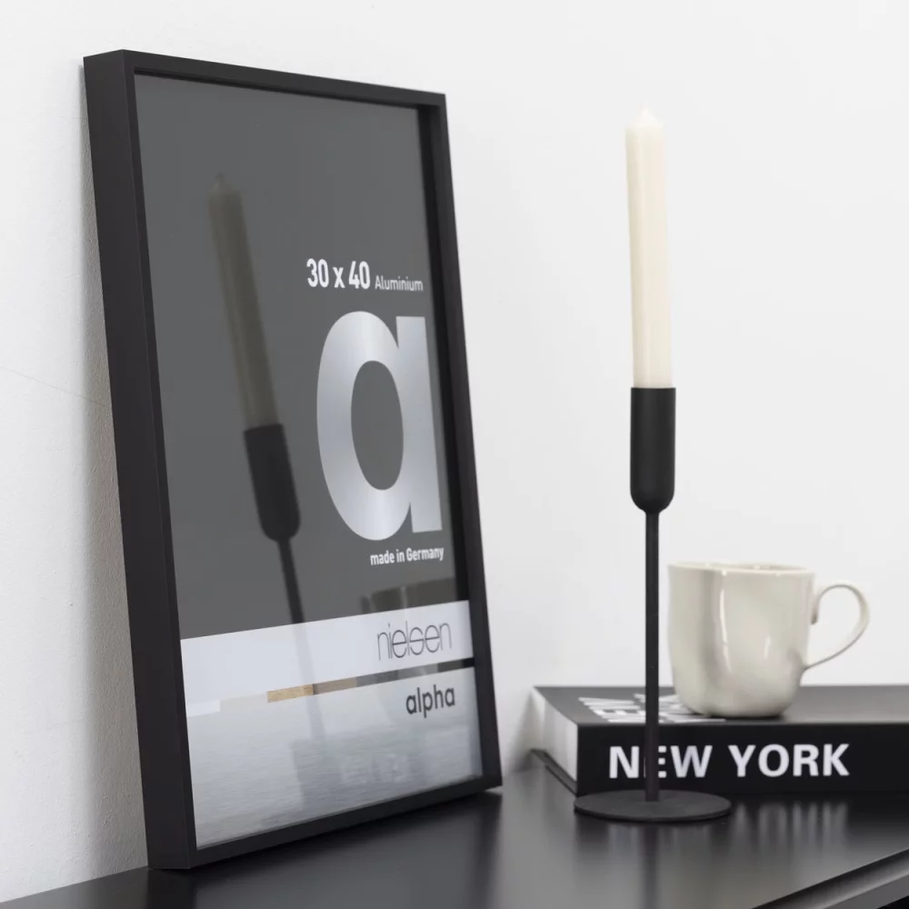 Bilderammen Alpha fra Nielsen er tilgjengelig med to glass: Floatglass med slipte kanter eller antireflekterende glass. Bruken av kvalitetskomponenter som ekstra sterke hjørneforbindelser og et stabilt bakpanel med dreiefjærer av høy kvalitet gjør denne rammen spesielt dimensjonsstabil.